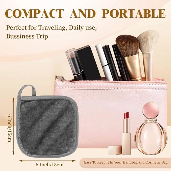 Small and portable: Our makeup remover cloth measures 15 x 15 cm and is foldable, lightweight and portable. It fits in a makeup bag. There's also a hanging ring on the side of the cloth, making it easy to hang after washing. It dries quickly, making it ideal for travel or business trips. Note: The size is measured manually and may have a 2 cm error. Please take this into account.