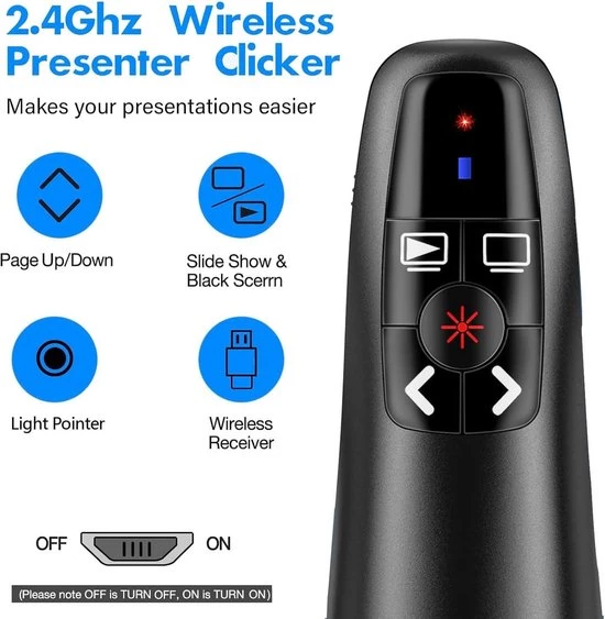 This wireless clicker is the perfect partner for your presentations, teaching, coaching, speech, meetings or conferences. With an intuitive presentation pointer, long operation and bright red light, and universal compatibility, this remote control makes giving presentations an effortless and professional experience.