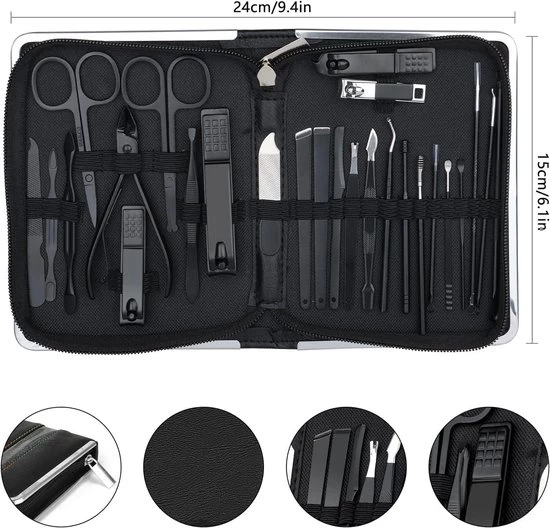 Benefits of the product:This manicure and nail clipper kit is made of high-quality stainless steel, making the tools sharp and durable without rusting. They're easy to use and designed for long-term use. Don't forget to remove the blue protective film from the edge of the storage bag to expose the stainless steel edge.