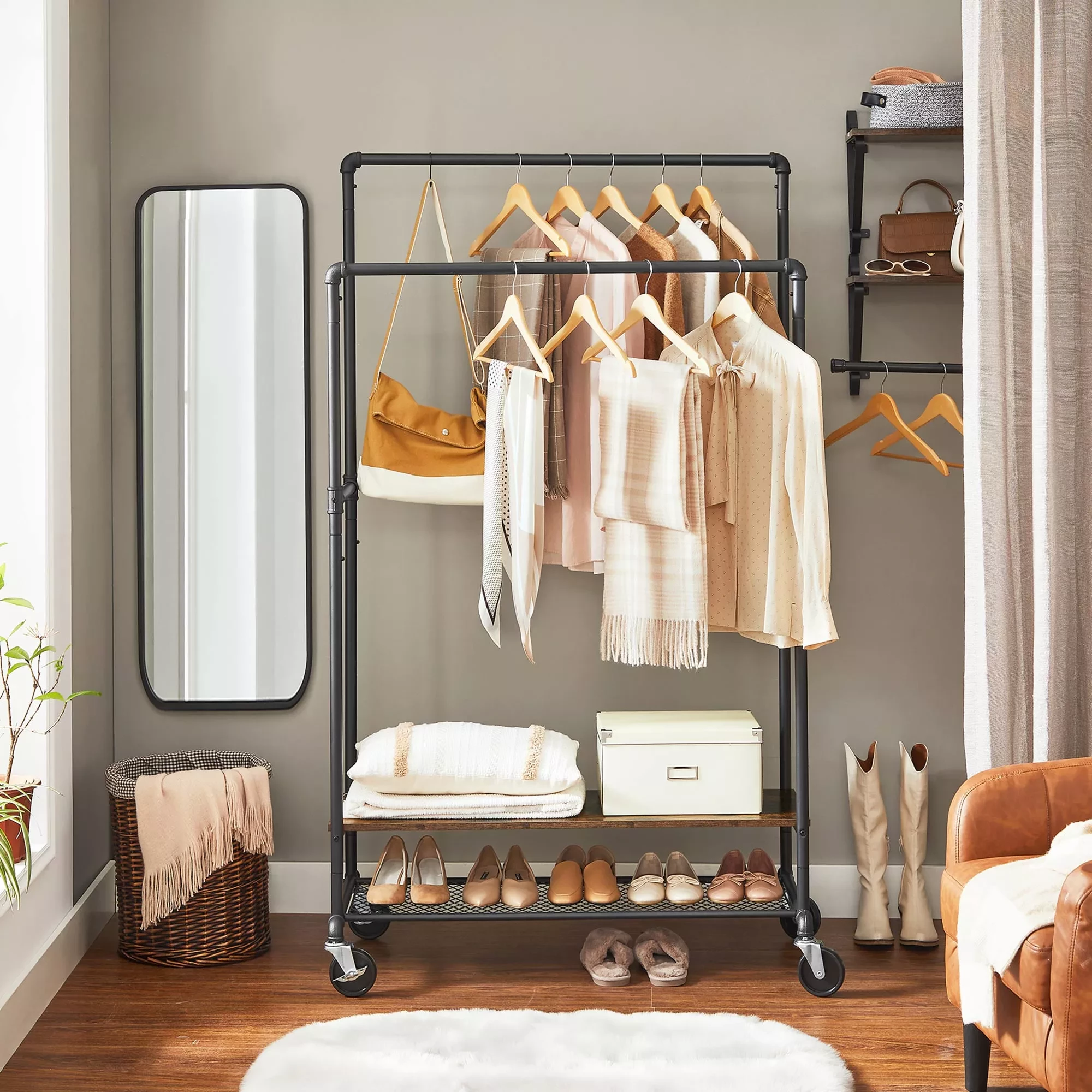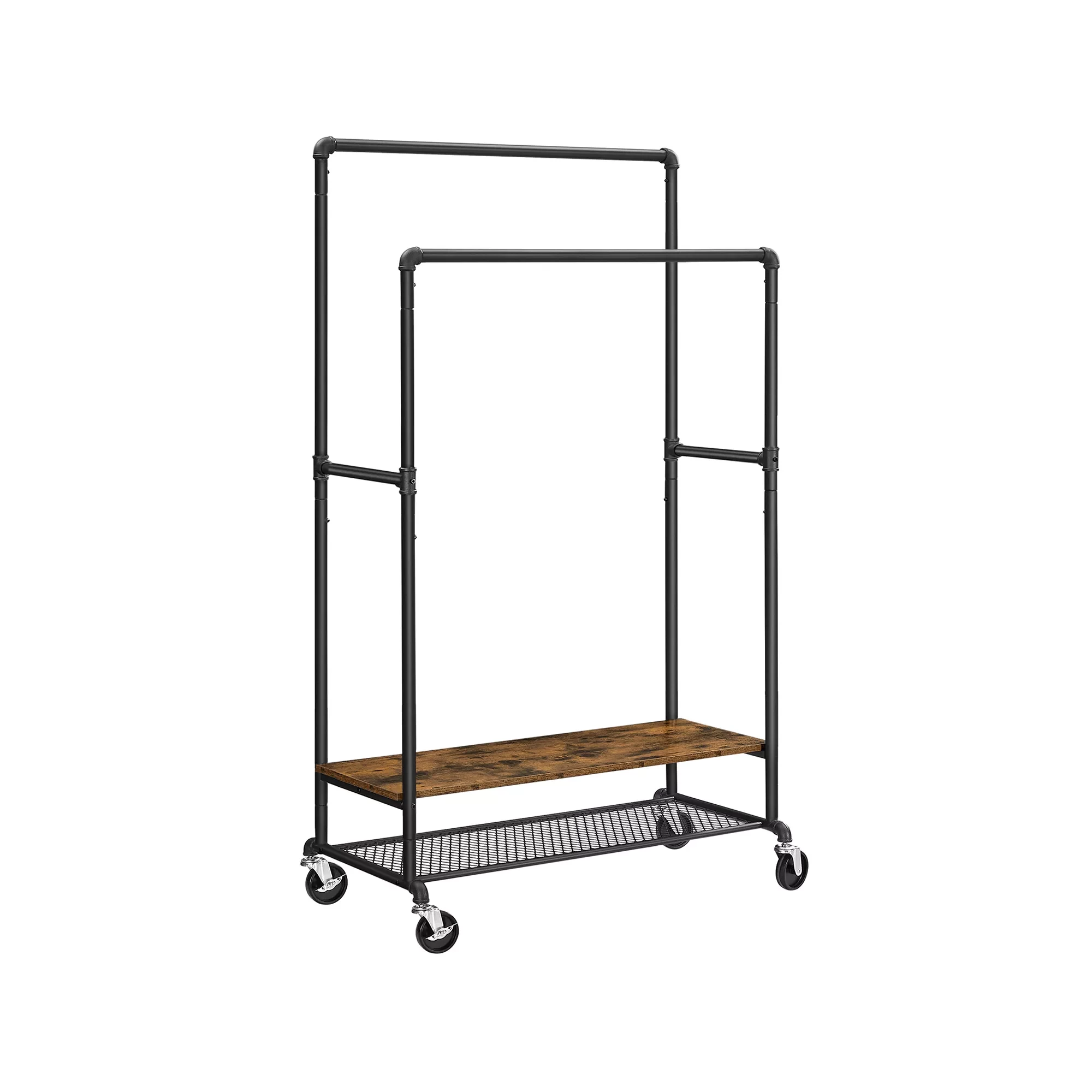 In And OutdoorMatch Clothes Stand Esperanza - With 2 Clothes Rails - Coat Stand - With 2 Shelves - With Castors - Industrial Design - Vintage Brown/Black