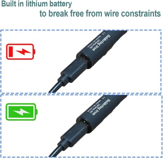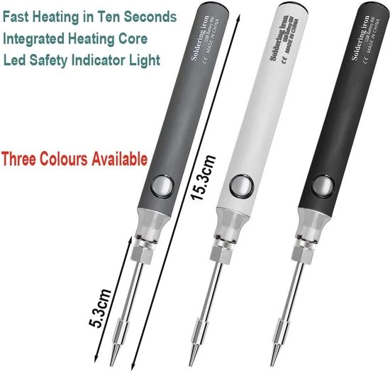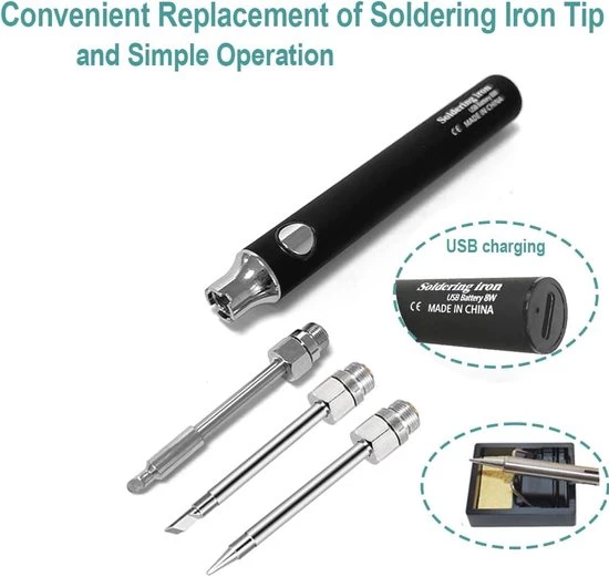 Discover our cordless soldering iron kit, ideal for all your soldering needs. This integrated kit includes solder wire, a tip cleaner, a sponge, and three different tip shapes, ensuring you're fully prepared for any project. The soldering iron heats up quickly in just 5 to 10 seconds to the desired temperature of 330 to 450°C, ensuring an efficient soldering experience. Thanks to USB charging capabilities, you can use this soldering iron anywhere, whether you're working outdoors in a classroom or in a location without an outlet. The soldering iron kit comes in a handy box with a manual, so you can easily keep everything at hand and take it with you. With three different tips, you're guaranteed to have the right solution for all your soldering projects.