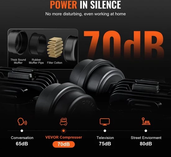 Powerful & Quiet: Dakta®'s 70 dB ultra-quiet air compressor is equipped with two high-quality mufflers. Each muffler consists of a thickened sleeve, a rubber muffler pipe, and a filter cloth. This not only reduces noise but also effectively prevents fine dust from entering.