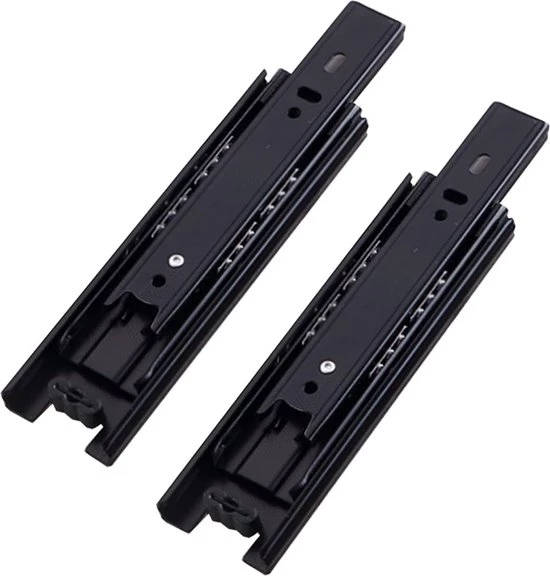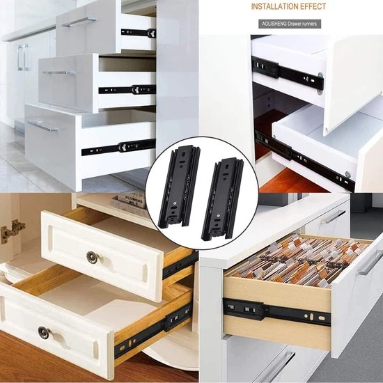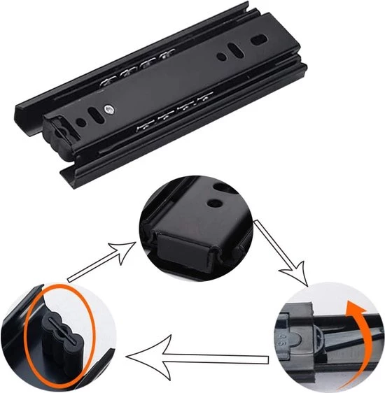 High-quality Material: Metallic black, selected thick cold-rolled steel, strong wear resistance, toughness and not easy to break, durable. 【Solid Steel Ball】With high-quality steel ball, imported lubricating oil and three-section rail design, it has achieved the mute function and high standard of endurance during the whole process. 【Quiet and Smooth】Built-in silent steel ball, sliding and pulling smoothly, no noise. 【Practical Removal Hook】The removal hook device does not require any extra tools, which is convenient for installation and removal and labor-saving. You can remove the inner rail by simply pushing and pulling the removal hook. Maximum load: 45KG.