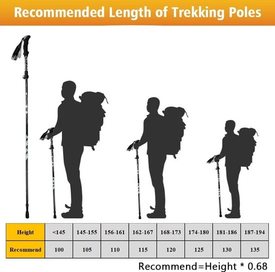 When folded, the poles are only 34 cm long, making them easy to store and carry in a backpack. Thanks to the telescopic function and locking mechanism, you can adjust the poles' length from 105 cm to 130 cm. This makes them suitable for people of all heights, with the poles adjustable to 0.68 times the hiker's height.