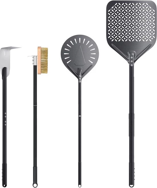This complete pizza accessory set contains everything you need to perfect your homemade pizzas. The set includes a 30 x 35 cm rectangular perforated pizza peel, perfect for safely placing your pizza in and out of the oven, and a 23 cm round pizza paddle for turning and handling the pizza while cooking. There's also a 15 cm adjustable stainless steel brush with soft brass bristles for thorough cleaning of your oven, and a spindle angle for easily removing dirt. Made of high-quality aluminum, these accessories are heat- and rust-resistant, making them ideal for both indoor and outdoor use. Each piece is designed for ease of use, with a lightweight construction and an ergonomic handle for easy handling and storage.