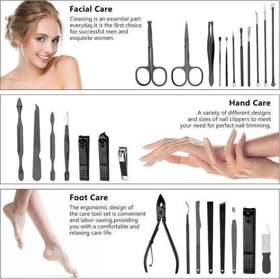 Benefits of the product:This manicure and nail clipper kit is made of high-quality stainless steel, making the tools sharp and durable without rusting. They're easy to use and designed for long-term use. Don't forget to remove the blue protective film from the edge of the storage bag to expose the stainless steel edge.