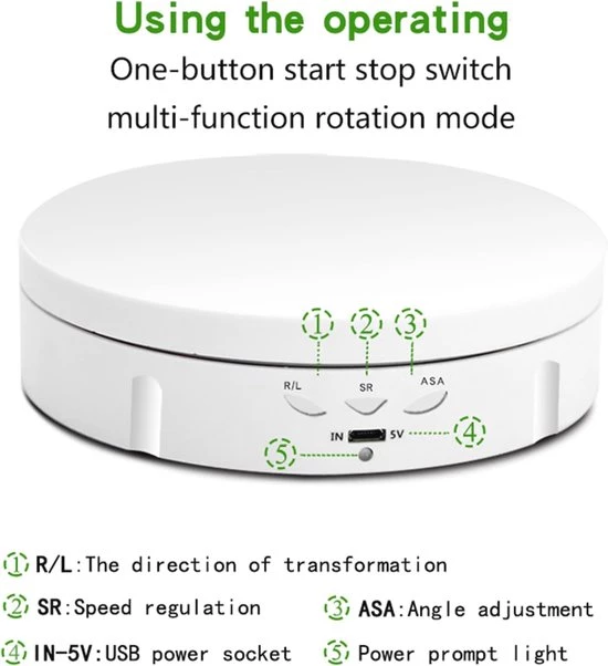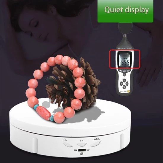 This electric turntable offers 360-degree rotation, ideal for product presentations, jewelry displays, and photography. With a robust capacity of up to 100 kg and a compact size of 15 x 36 cm, it is perfect for wedding cakes and other decorative items. The turntable has a continuous rotation angle of 45°, 90°, 180°, and 360°. Made of durable ABS, it can operate in temperatures from -10 °C to 80 °C. The set includes an electric turntable, an English manual, and a USB cable for easy charging. Note: For optimal performance, use the included USB cable for charging. It is normal for slight jitter to occur when changing the rotation angle due to rotational inertia.