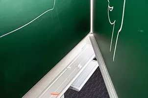 Board with 5 writing surfaces in enamel steel white (800C) or green. Anodized 19 mm aluminum profile with plastic corner pieces, including marker tray with two sponge trays and chalk collection trays at the bottom of the wings. Mounting on a fixed wall. 100x400cm with side flaps