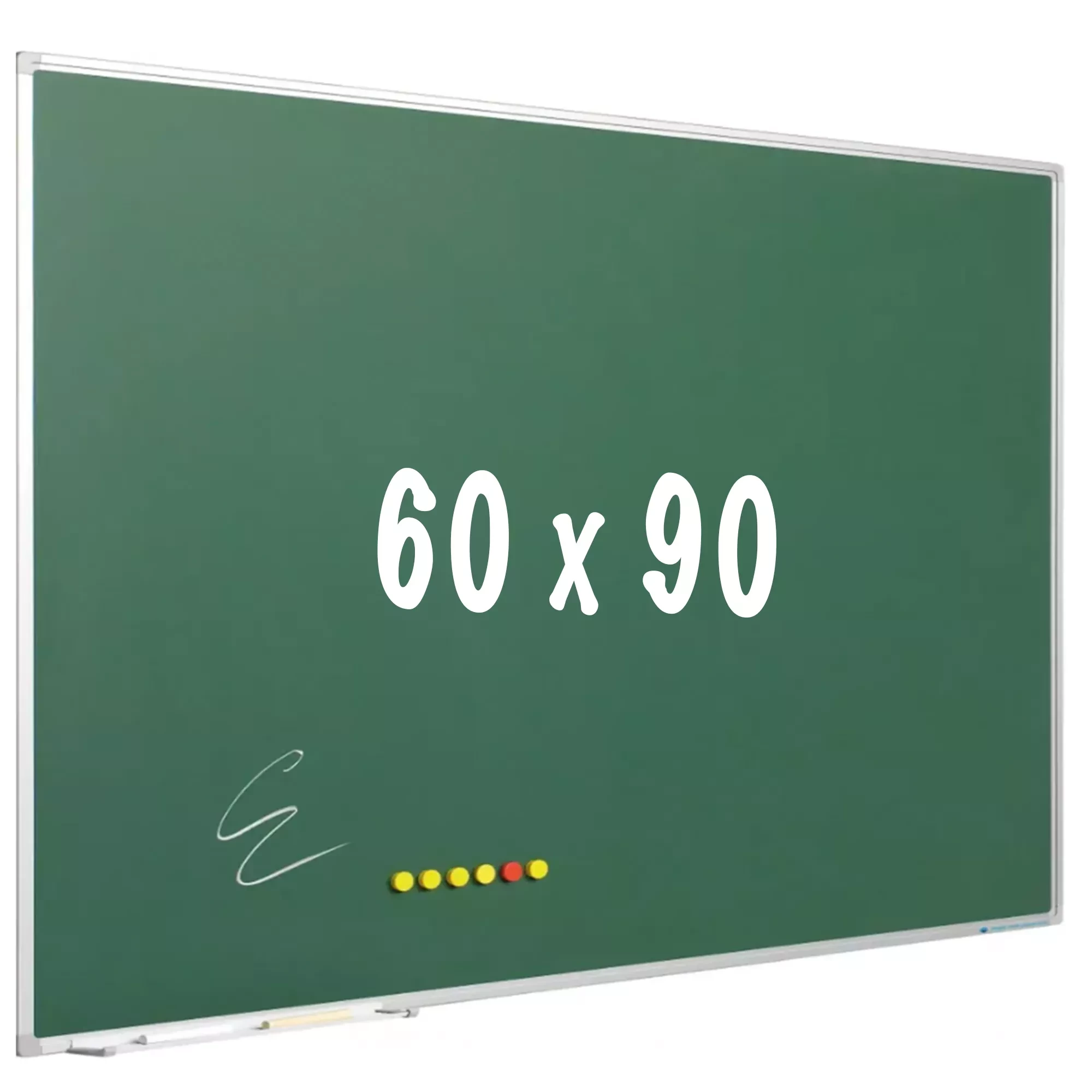 Chalkboard in green or gray enamelled steel. Magnetic and erasable. Anodized aluminum softline profile with plastic gray corners. Including hanging material and marker tray of 30 cm.