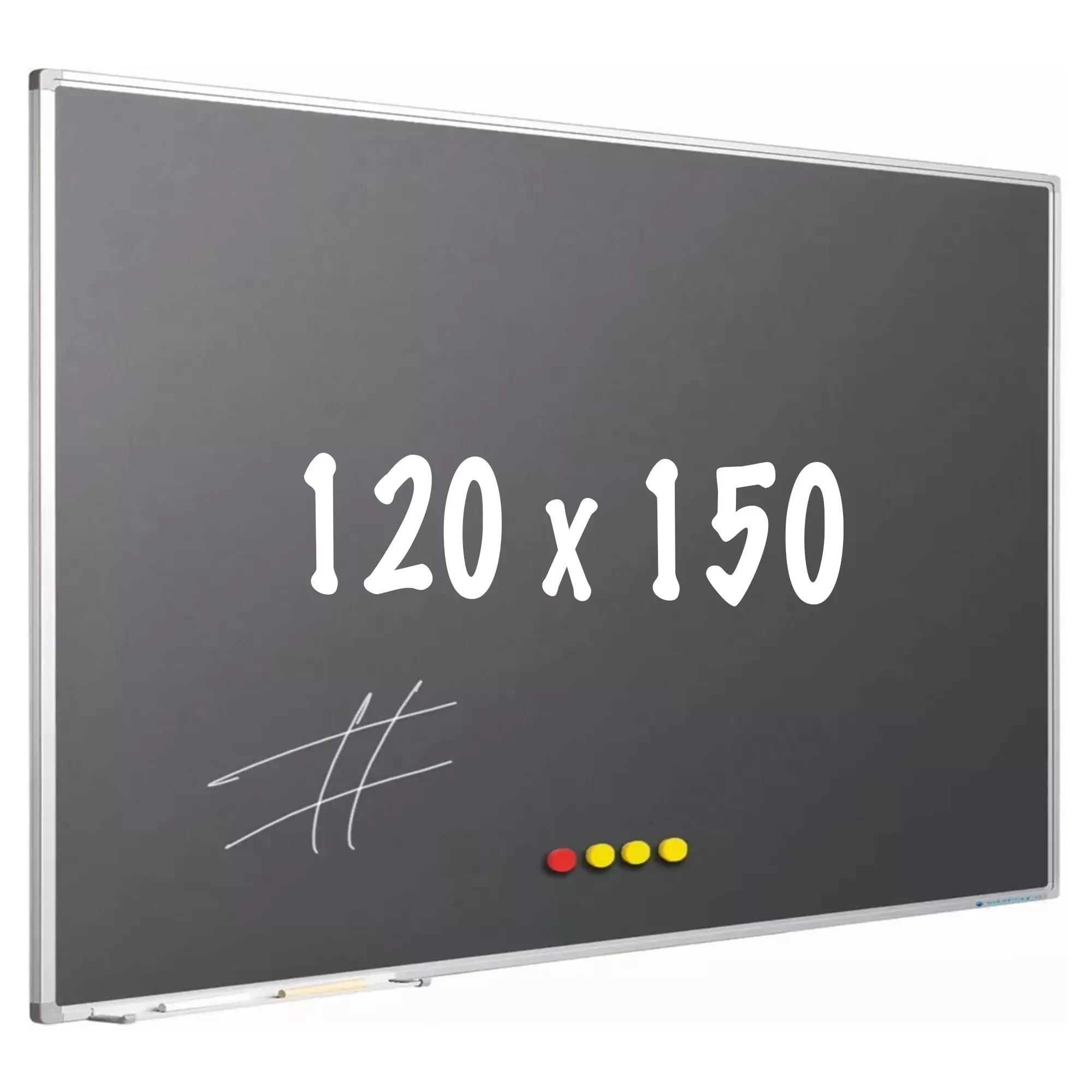 Chalkboard in green or gray enamelled steel. Magnetic and erasable. Anodized aluminum softline profile with plastic gray corners. Including hanging material and marker tray of 30 cm.