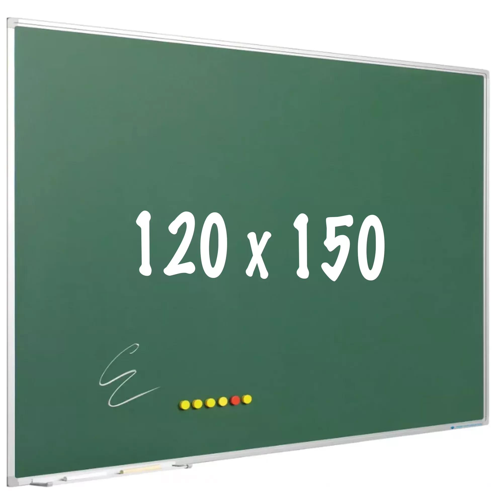 Chalkboard in green or gray enamelled steel. Magnetic and erasable. Anodized aluminum softline profile with plastic gray corners. Including hanging material and marker tray of 30 cm.