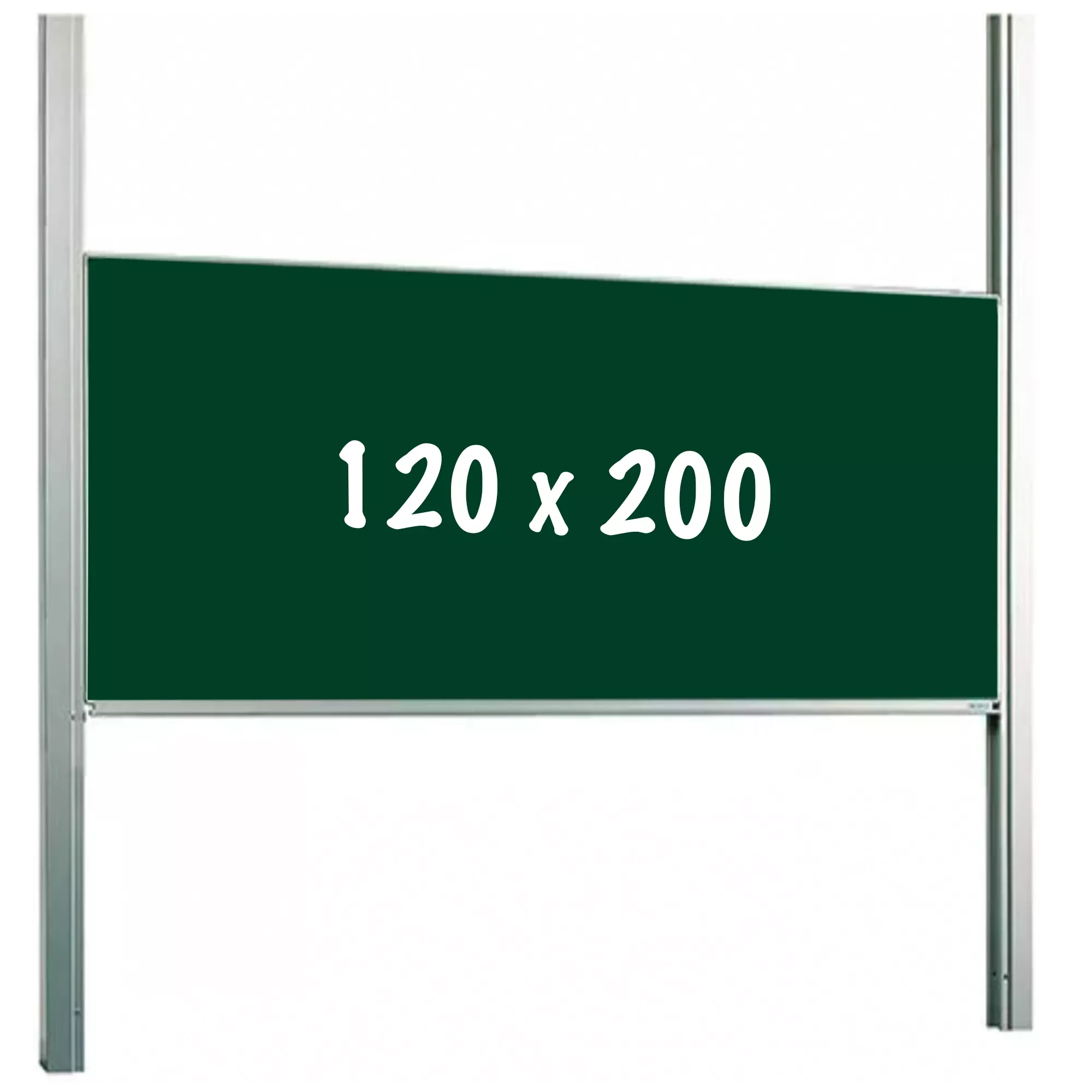 Board with 1 writing surface in enamel steel white (800C) or green. Anodized 19 mm aluminum profile with plastic corner pieces and chalk collection gutter. Mounting between two columns, standard height: 265 cm. Longer columns: optional.