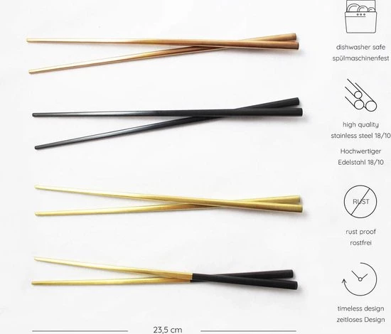 This stylish Asian cutlery set from Heimzeit should not be missing in your kitchen! With its timeless design and high quality, this cutlery is perfect for everyday use. The elegant shapes and fine finish make this cutlery a beautiful addition to your table.Benefits of this product: - Timeless design - High-quality stainless steel - Suitable for various dishes such as sushi, rice and noodles - Dishwasher safe for easy cleaning - Nice and long-lasting thanks to the precise cut of chrome nickel steelWith these steel chopsticks from Heimzeit you can enjoy your favorite Asian dishes in style. Whether for a casual dinner or a festive occasion, these chopsticks fit any setting. Product specifications: - Material: stainless steel - Dimensions: 23 cm - Dishwasher safeComplete your collection with other products from Heimzeit, such as elegant clips and candlesticks. Discover the range in different colors and sizes and create a stylish atmosphere in your home. Perfect for your own use or as a gift for someone special.