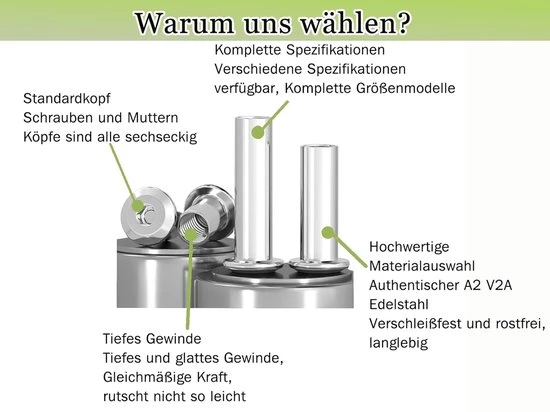 These connection screws are ideal for securely and permanently fastening wooden planks and furniture. Measuring M5 x 20 mm, these sleeve screws are perfect for joining cabinets and other furniture. Made of high-quality stainless steel (A2 V2A), they are corrosion-resistant, making them suitable for both indoor and outdoor use.