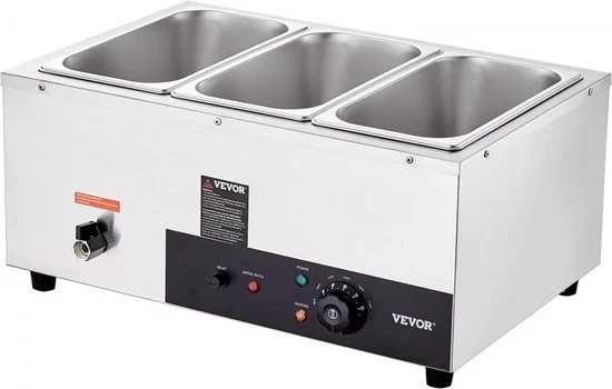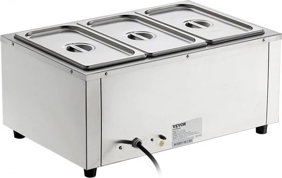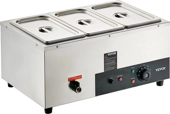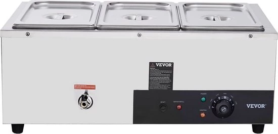 INCLUDES THREE 1/3 LARGE FOOD PANS: Our commercial food warmer comes with three 8 square meter (6.9 x 12.8 x 5.9 inches / 176 x 325 x 150 mm) food pans and their matching lids, so you can have three different dishes served at the same time. Prepare your guests piping hot steamed vegetables, juicy hot dogs, boiled eggs, sizzling bacon and other delicious dishes. FAST HEATING & LONG-LASTING HEATING: This impressive food warmer features a powerful 1500W SUS 304 stainless steel heating tube that heats up your food quickly, so it retains its warm and delicious taste. Thanks to the temperature controller, you can adjust the temperature between 86 and 185 ℉ (30-85 °C) as needed. EXTRA SAFETY: We have equipped our food warmer with a newly developed "dry burn indicator" and a "reset button". The dry burning indicator will automatically stop heating food when the temperature is higher than 248°F/120℃. To resume operation, simply add water and press the reset button. Robust stainless steel housing: Since the cooker is made entirely of stainless steel, cleaning and maintenance are easy. The food tray (0.03 inch/0.76 mm thick) adds extra durability and safety, while the thickened wall ensures strength and a secure water seal. Thoughtful details: The water tank is thoughtfully designed and has water level markings on the inside for effortless water maintenance. The tank has a tap to drain the water after use, so there is no need to clean the inside of the machine. Two extra-long ladles are also included, which are perfectly suited for the 5.9 inch/150 mm deep pots.