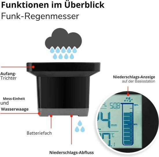 Advanced Precipitation Measurement : This electronic weather station has a wireless sensor with a range of up to 60 meters in open space. It not only measures the amount of precipitation, but also functions as a thermometer for both the outside temperature and the room temperature.