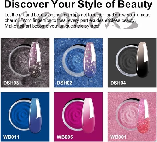 Why choose the Color Change Dip Nails Powder Starter Kit? With the Color Change Dip Nails Powder Starter Kit, you'll have everything you need for beautiful, long-lasting nails. This kit includes 6 different color change dip powders, 4 dip liquids, and handy manicure tools.