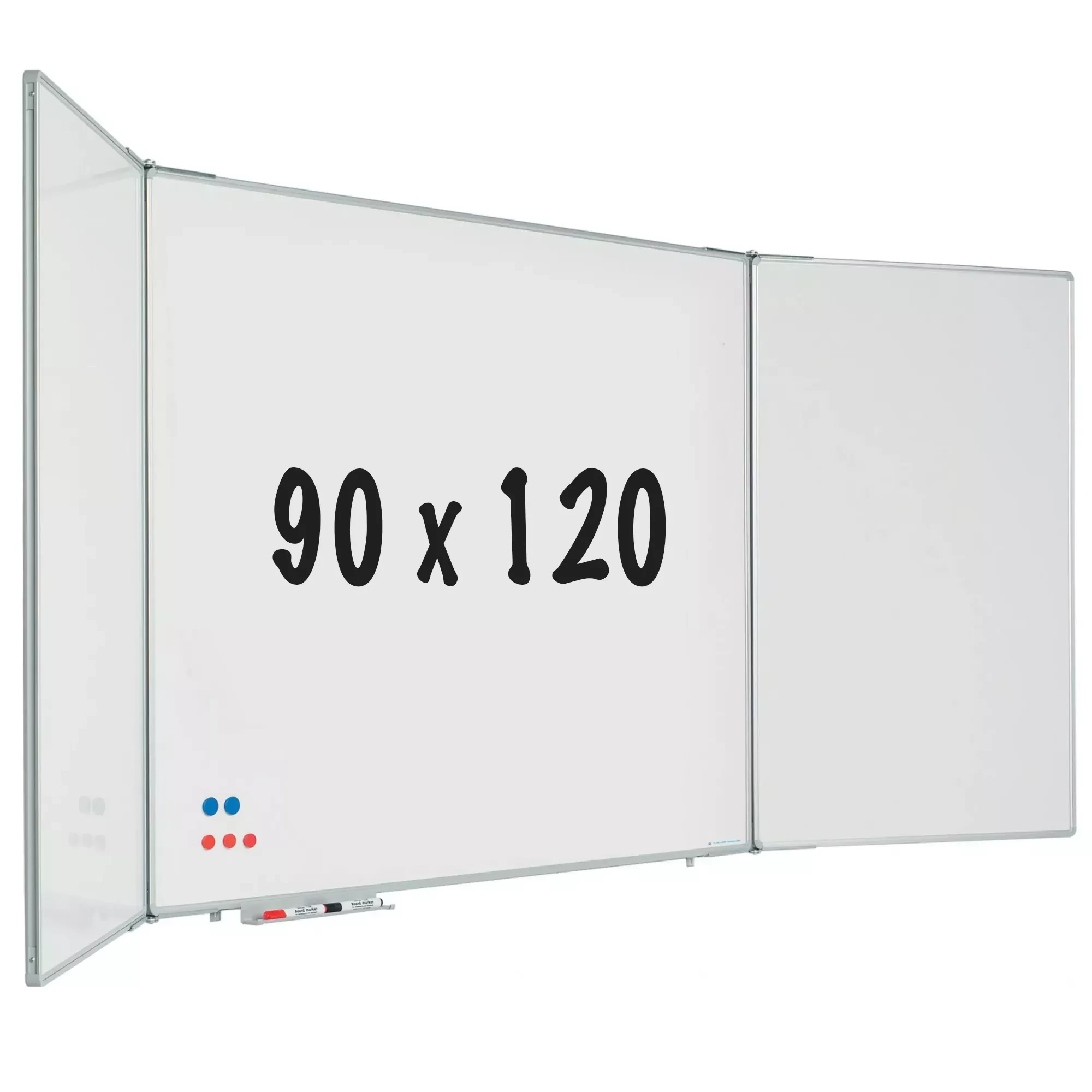 Whiteboard with five writing surfaces of white enamel steel (800C). Extra wings provide more writing space. Anodized aluminum RC profile with gray plastic corner pieces. Including deposit tray.