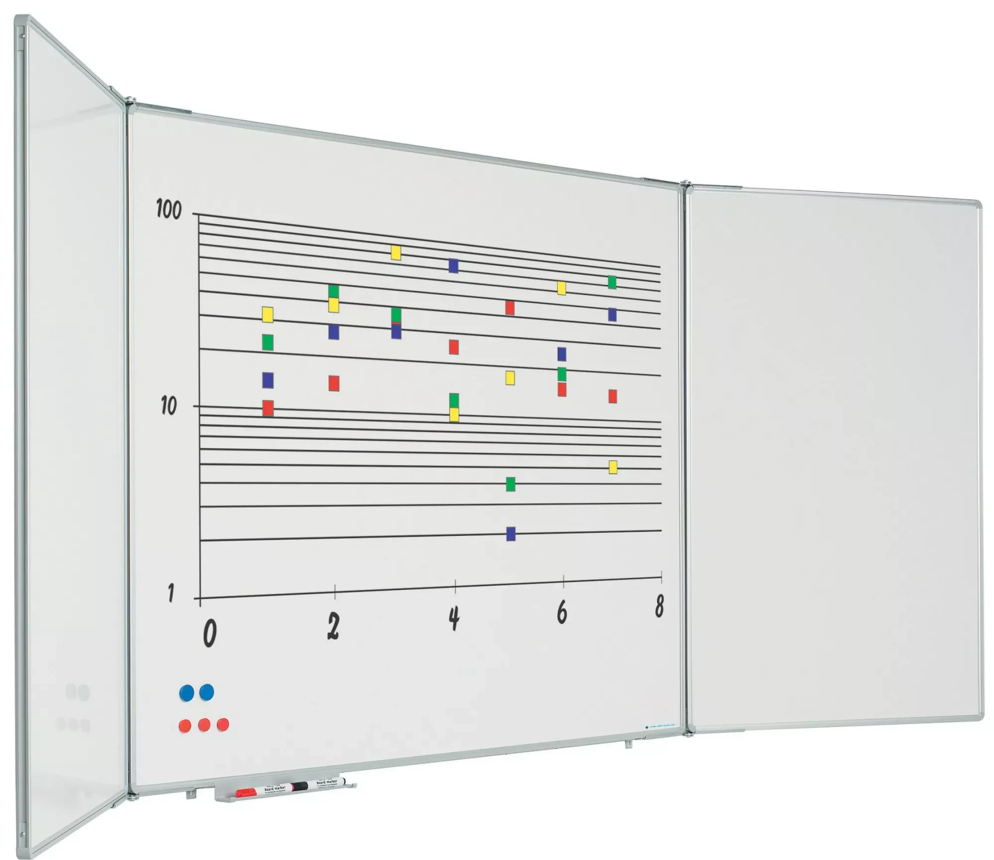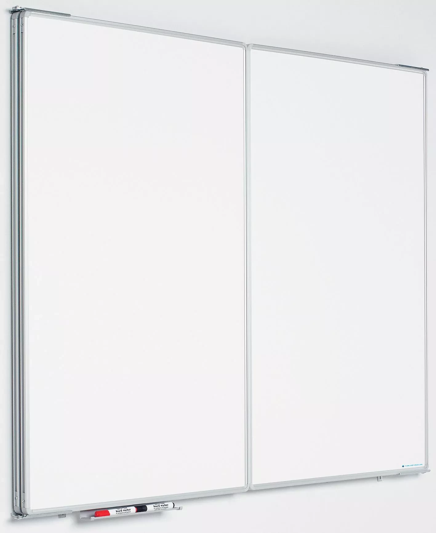 Whiteboard with five writing surfaces of white enamel steel (800C). Extra wings provide more writing space. Anodized aluminum RC profile with gray plastic corner pieces. Including deposit tray.