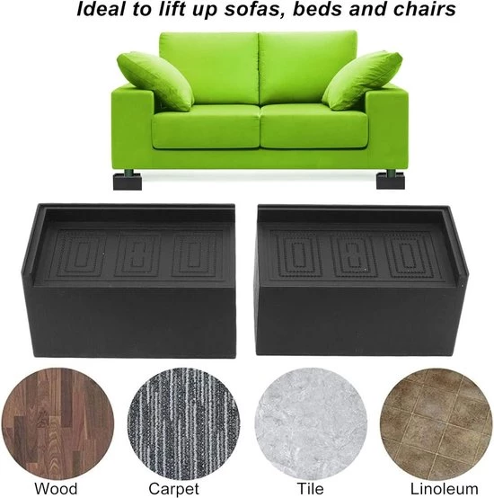 Our furniture risers are designed to enhance your living environment and offer you greater comfort. By raising your furniture, you not only create a more comfortable and safe experience for yourself, but also create extra space for storage and cleaning. The black finish of the risers ensures they don't get dirty easily and blend seamlessly into any interior.