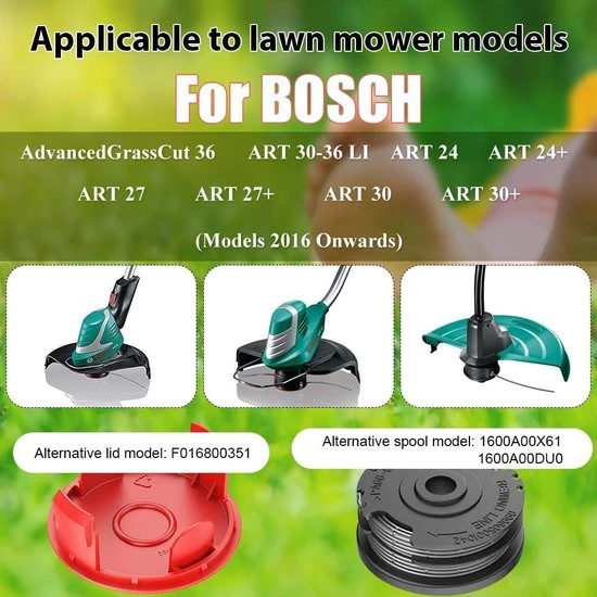 Advantages of the grass trimmer spool:With the grass trimmer spool for Bosch trimmers, you're guaranteed optimal performance from your trimmer. The package includes 6 spools and 2 spool covers, so you'll have plenty of spare parts for maintaining your garden. Thanks to the spool's easy installation, you're always guaranteed consistent trimming results. The spool is made of high-quality materials for long-lasting use.