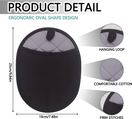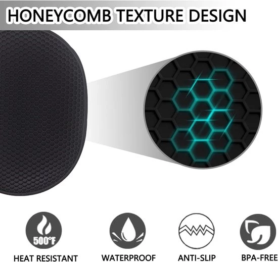 Discover our heat-resistant silicone potholders with a honeycomb structure, ideal for safe cooking and baking. Made of food-safe silicone and natural cotton, these potholders provide a secure grip and heat protection. With a unique ergonomic oval design, they're easy to use and help prevent scratches on your kitchen countertop. Suitable for pots and pans of various sizes, they're a must-have in any kitchen. Includes two potholders in a stylish black color.