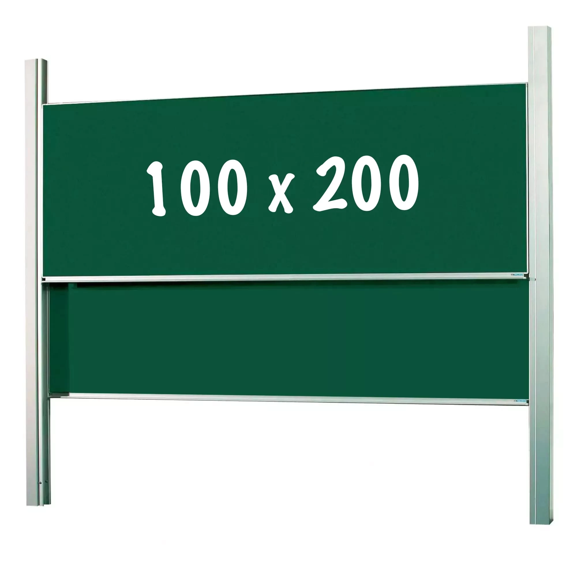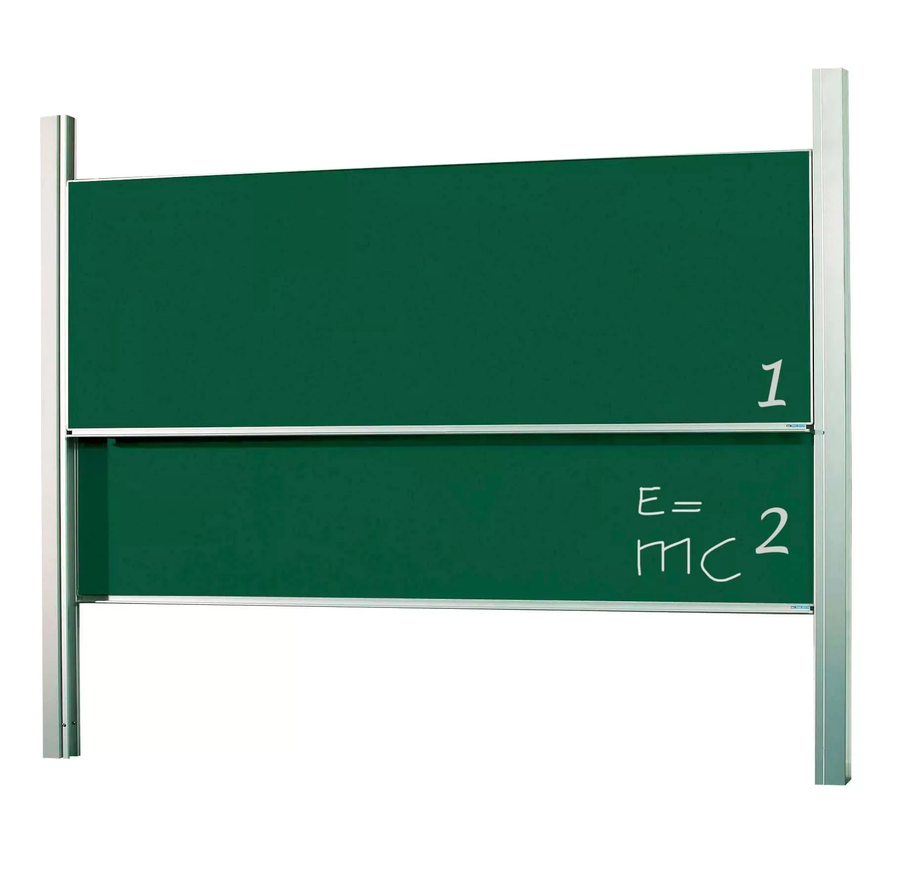 Twee enkelzijdige planken die onafhankelijk van elkaar in hoogte kunnen bewegen in wit (800C) of groen geëmailleerd staal. Geanodiseerd 19 mm aluminium profiel met kunststof hoekstukken en krijtopvanggoot. Montage tussen twee dubbele kolommen, standaard lengte: 265 cm. Langere kolommen: optioneel.