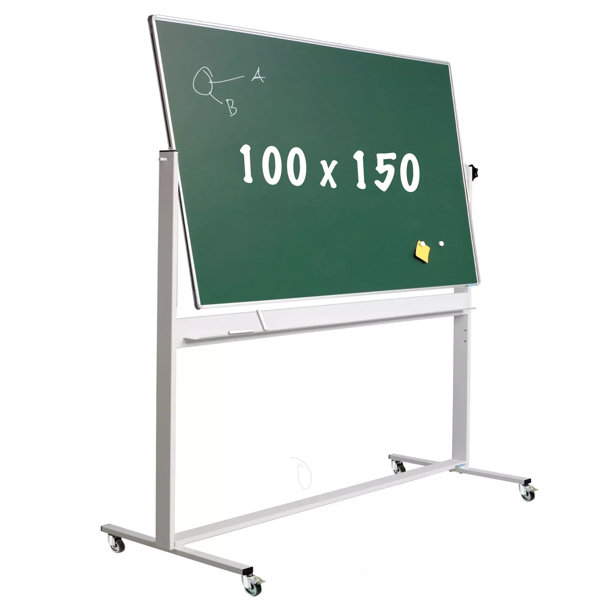 Dubbelzijdig beschrijfbaar bord van groen geëmailleerd staal en aluminium RC-profiel. Dankzij de draaiknop is het bord 360 draaibaar en in elke hoek vast te zetten. Het witstalen rek is voorzien van een lange markeringsbak en 4 stevige wielen (waarvan 2 met rem). Geschikt voor regelmatige of intensieve beweging van het kantelbord.