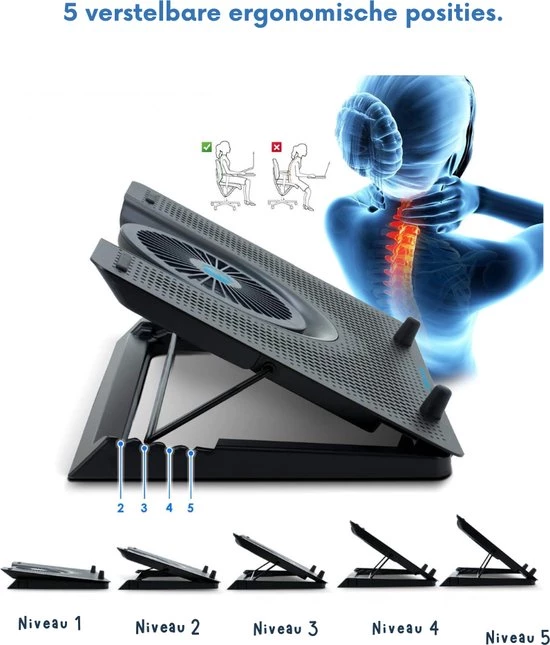With the adjustable height settings you can adjust the Laptop Cooler to your ideal working height. This prevents neck and back complaints, so you can work comfortably for longer without discomfort.