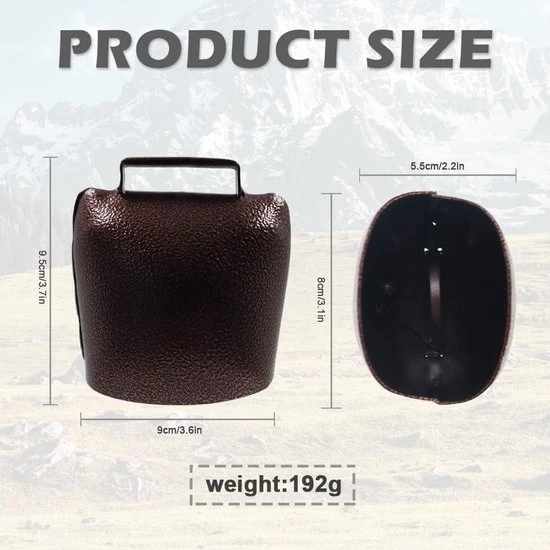 Advantages:The large cowbell measures 9.5 x 8 x 5.5 cm and is easy to carry in your backpack. The diameter of the internal metal ball is approximately 0.4 cm, which produces a pleasant sound and lasting echoes. The bell is made of high-quality metal with a uniform vacuum plating and an antique brass finish that won't easily fade.