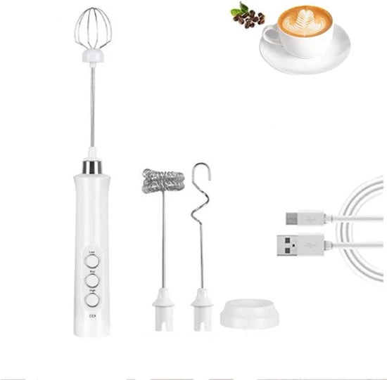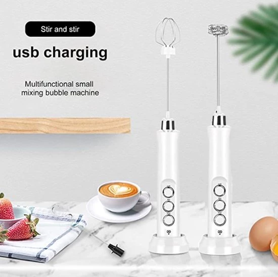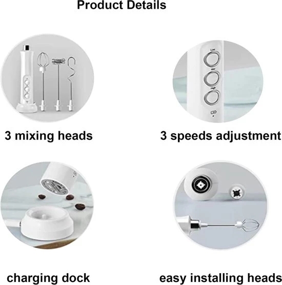 Advantages of our milk frother:Our electric milk frother comes with three interchangeable whisks, including a balloon whisk for whipping cream and egg whites, a U-shaped whisk for mixing butter, olive oil, and powdered milk, and a spring-loaded whisk for frothing milk and beverages. With adjustable speed settings and a powerful battery, this appliance is reliable and durable. The convenient charging station ensures your milk frother is always ready to use, and the compact design makes it easy to take with you wherever you go.