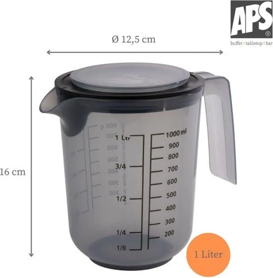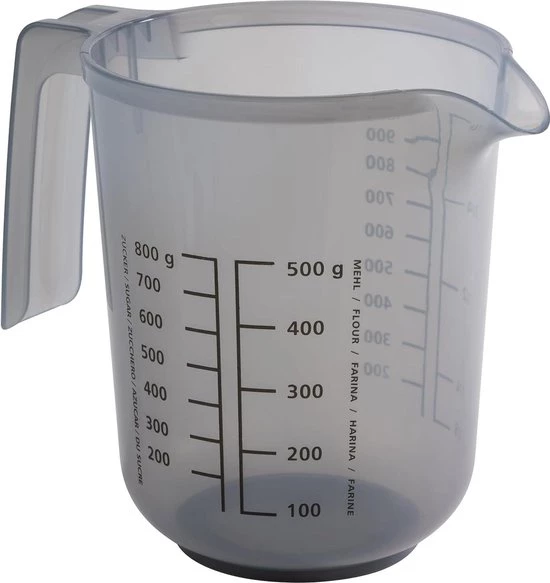 This grey measuring cup is the perfect kitchen aid for accurately measuring liquids, sugar and flour. With its handy lid it can also serve as a mixing cup, making overfilling a thing of the past.