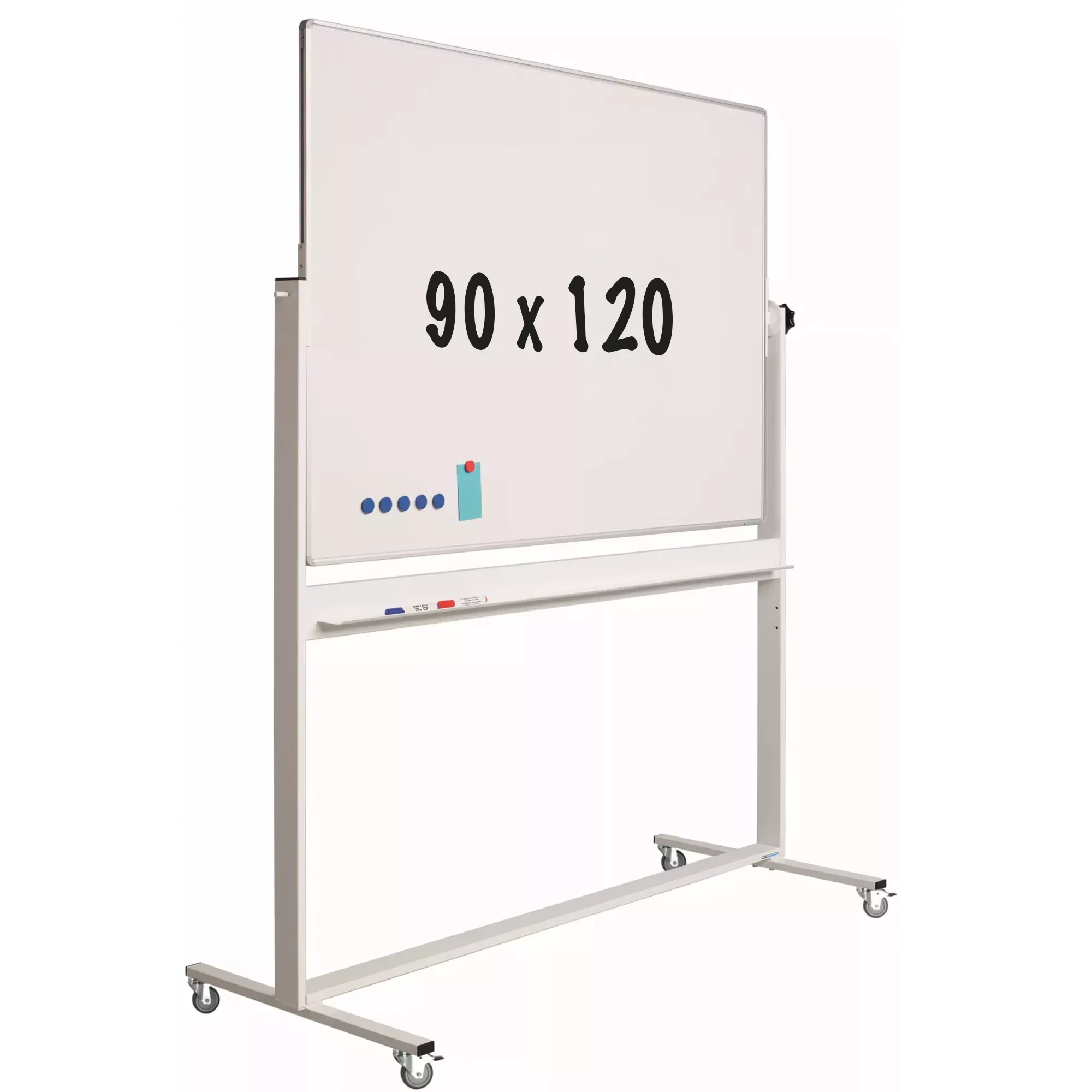 Double-sided writable tilting board made of white lacquered steel with aluminum RC profile. The board can be rotated 360° using the rotary knob and can be fixed in any angle. The robust white steel base is equipped with a long pen tray and 4 solid industrial wheels (2 with brakes), making it suitable for intensive moving.