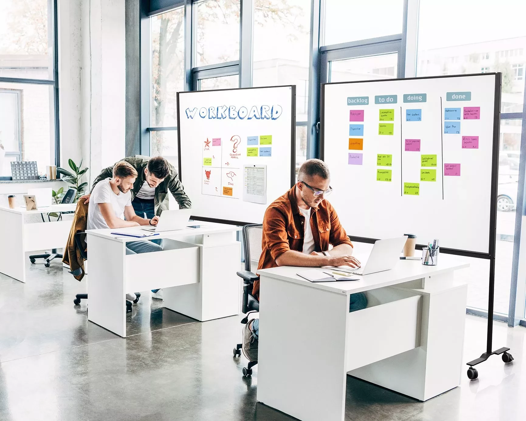 Make work visible! This double-sided whiteboard is designed for visual communication based on customer needs. Use the Workboard for scrum sessions or other forms of agile working, planning, task lists, brainstorming sessions or for holding workshops.