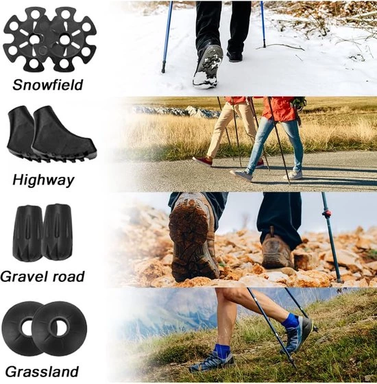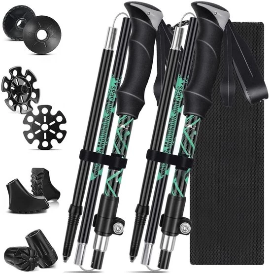 The trekking poles are made of aircraft-grade aluminum alloy, making them durable and lightweight. They come with a storage bag and four accessories, making them suitable for various terrains, such as deserts, snowy mountains, grasslands, and paved roads.