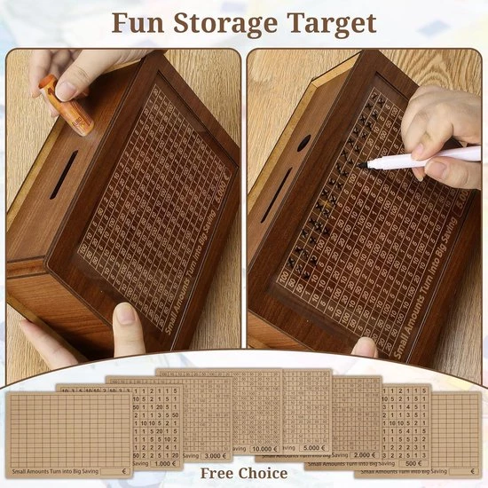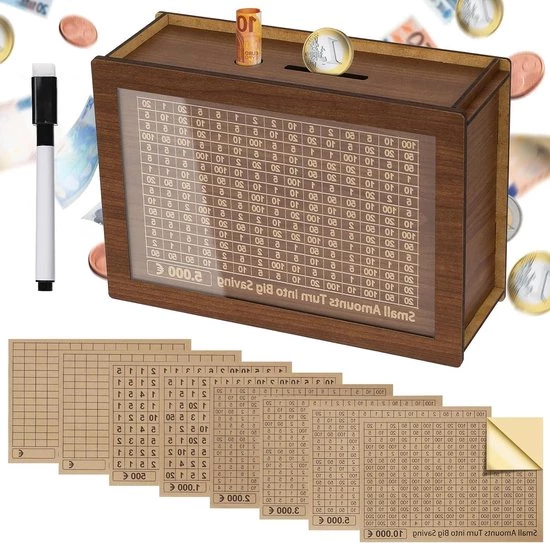 The Wooden Money Box is a high-quality and safe way to save money. Made of eco-friendly wood, this money box is durable and perfect for both adults and children. With various savings goal stickers and a marker, this money box helps you set financial goals and improve your self-discipline.