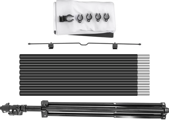 This screen can be set up effortlessly in just a few steps and without tools. The tension rods simplify the assembly of the frame, while the top clamps keep the screen firmly in place.
