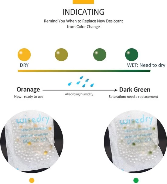 [Desiccant with Indicator] – This silica gel contains orange granules that help users quickly see when the desiccant needs to be replaced. The orange crystals turn black-green when full of moisture. [Regenerable Silica Gel Packets] – Reusable by heating in the microwave or oven. Microwave: Low temperature for a few minutes. Oven: Temperature < 110°C. Only charge when the packets are not fully saturated to prevent melting or fire. [Safe Double Packaging & Easy Storage] – 10g x 30 count vacuum-packed and in a sealed aluminum zip-lock bag keeping the packets protected before use. [Food-Grade Silica Gel] – Up to 35% moisture absorption capacity. Cobalt chloride free and non-toxic, food and drug safe. Use this orange silica gel instead of blue. [Satisfaction Guaranteed] – If you are not satisfied, contact us for a quick resolution.