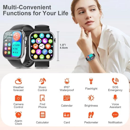 Smartwatch for men and women with Bluetooth, 1.83 inch HD, 110+ sports modes, sleep monitor, SpO2, heart rate monitor, IP68, fitness watch for iOS and Android