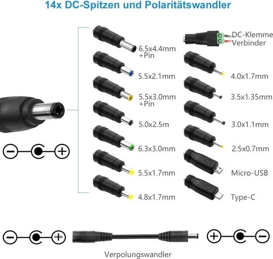 - Output: DC 3V 4V 4.5V 5V 5.5V 6V 9V 12V 14V 15V 19V 20V 24V (adjustable)