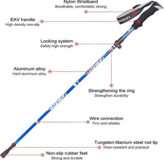 Adjustable top, the length is adjustable. This folding trekking pole is foldable and offers the comfortable size after folding. It can then be easily stored for backpack and luggage.
