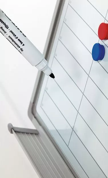 Workday planner with horizontal layout from Monday to Saturday with 37 fillable positions under each day. Equipped with anodised aluminum softline profile, including mounting material, marker tray 30 cm and magnetic horizontal day strip.