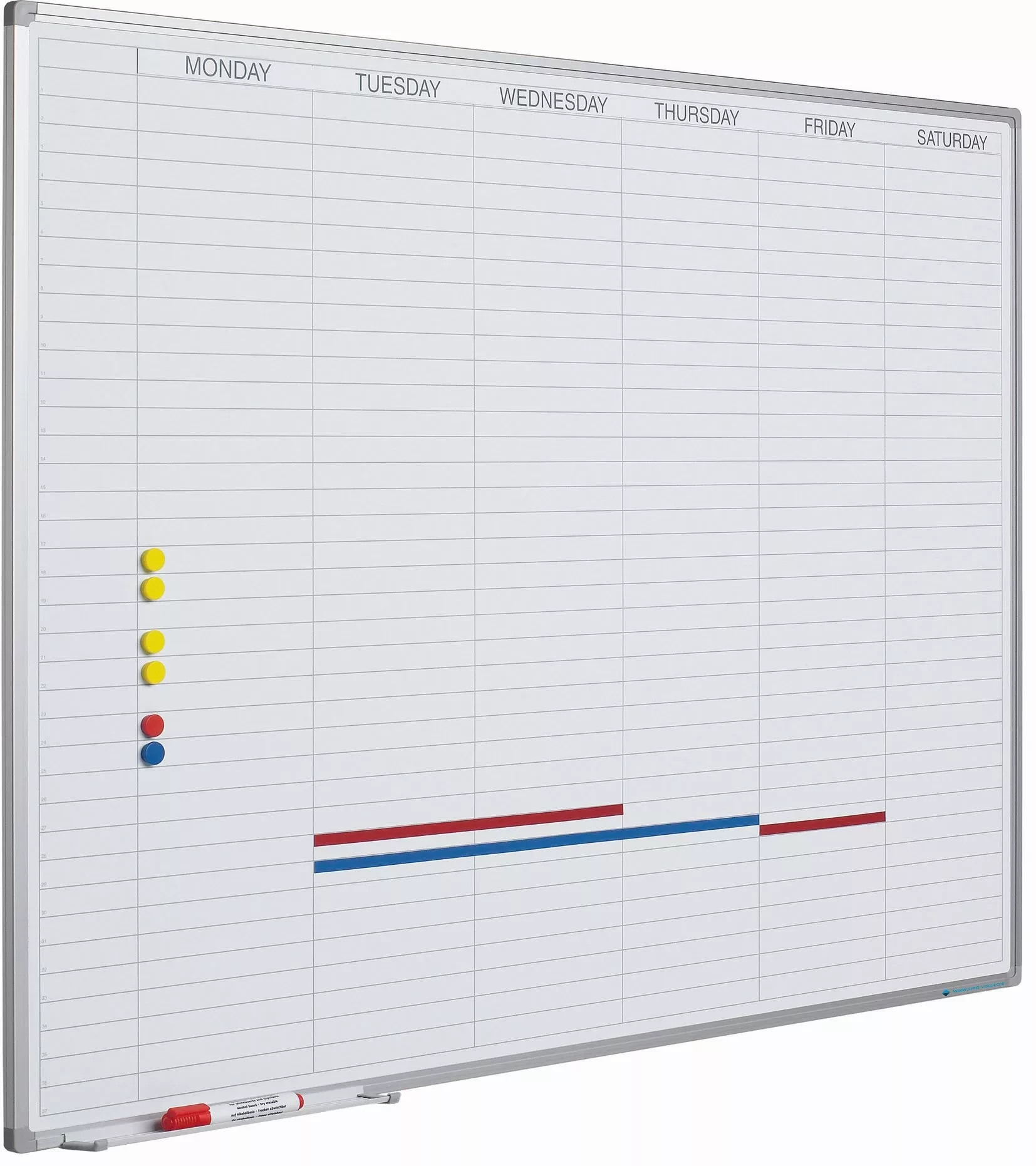 Workday planner with horizontal layout from Monday to Saturday with 37 fillable positions under each day. Equipped with anodised aluminum softline profile, including mounting material, marker tray 30 cm and magnetic horizontal day strip.