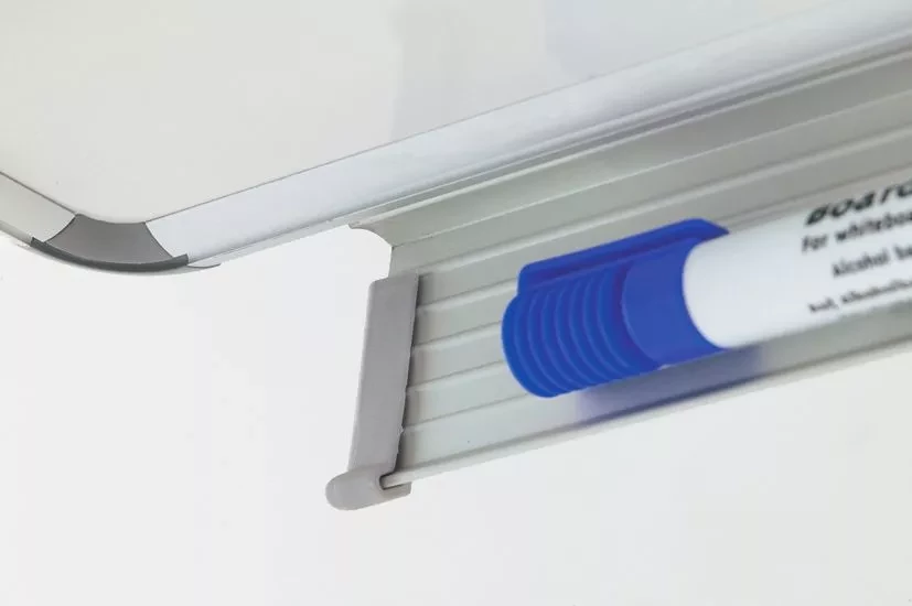 High quality white enamelled steel whiteboard (800C). Whiteboard for very intensive and durable use. Anodized aluminum design profile with plastic gray corners. Including hanging material and marker tray of 30 cm.