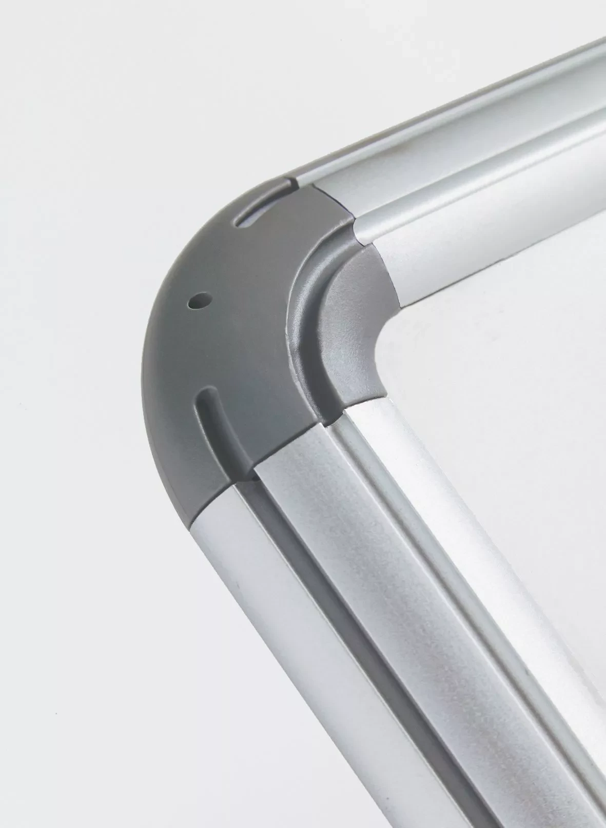 High quality white enamelled steel whiteboard (800C). Whiteboard for very intensive and durable use. Anodized aluminum design profile with plastic gray corners. Including hanging material and marker tray of 30 cm.