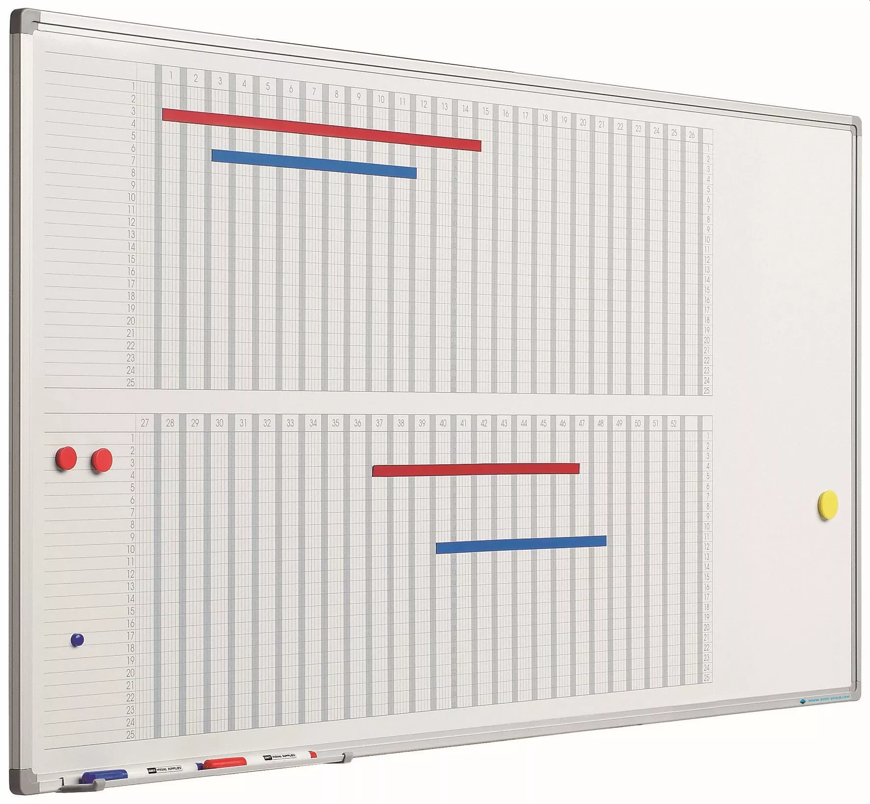 Horizontally there is room for 53 weeks and vertically there are 25 freely writable positions available per week. Equipped with anodized aluminum softline profile including mounting material and 30 cm marker tray.