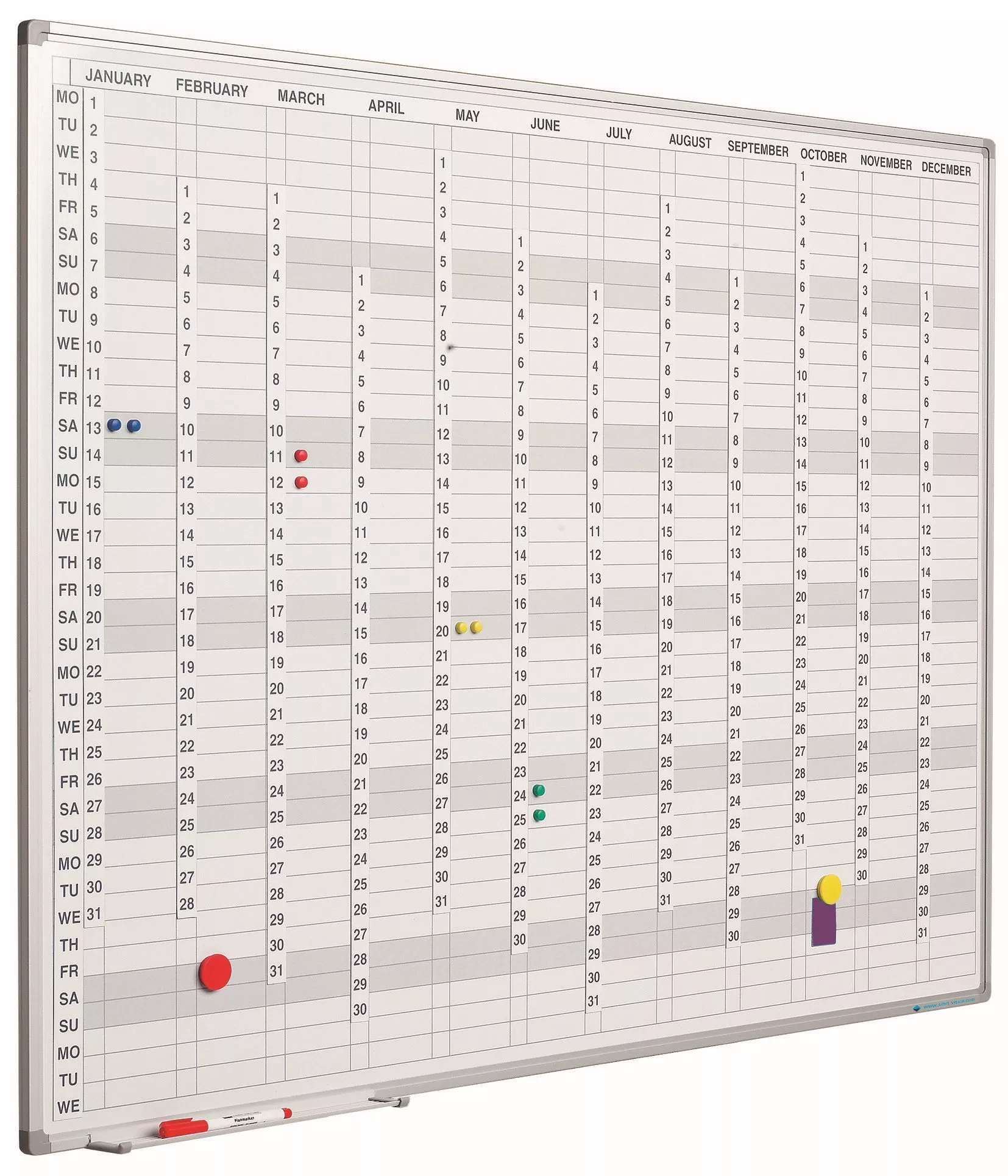 Timeless year planner. The months, days and dates can be indicated every year by means of magnetic strips. Equipped with aluminum anodized softline profile. Including hanging material, marker tray 30 cm, vertical number strips, horizontal month strip and vertical day strip.