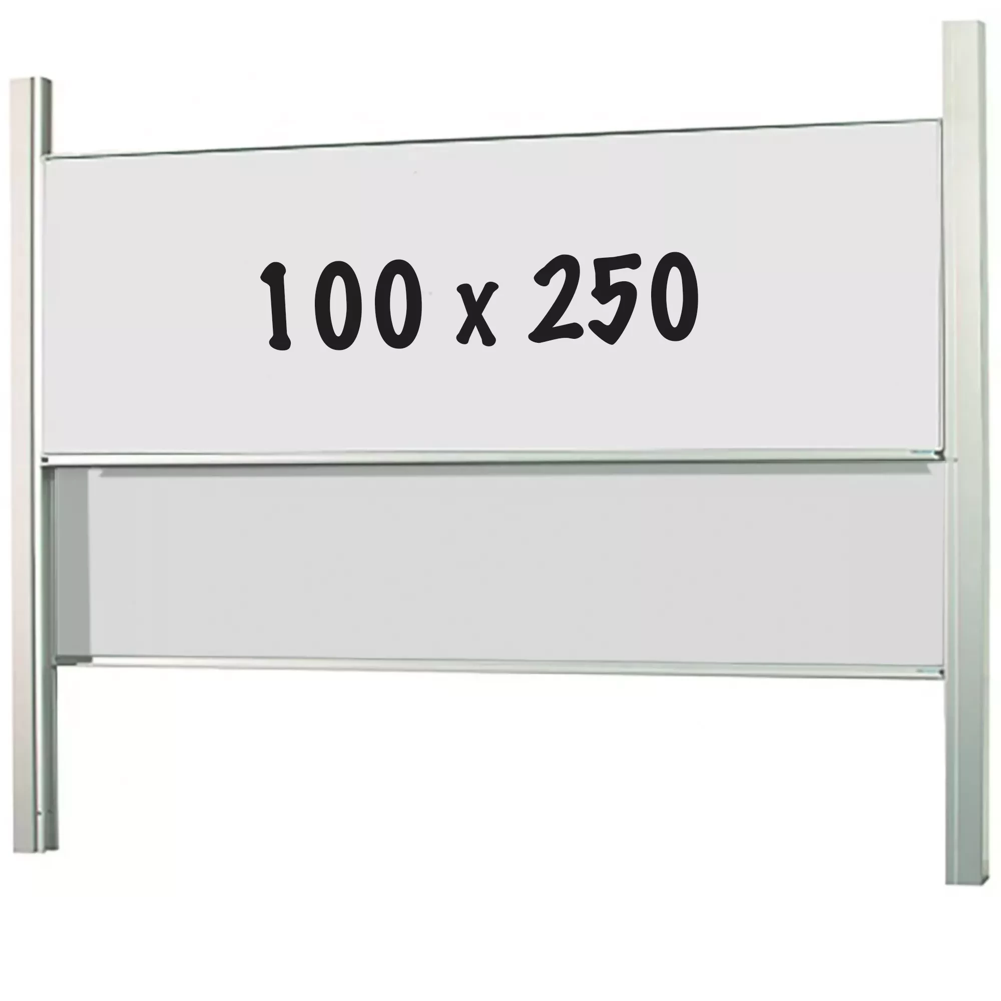 Two single-surface boards that can move independently of each other in height in white (800C) or green enamel steel. Anodized 19 mm aluminum profile with plastic corner pieces and chalk collection gutter. Mounting between two double columns, standard length: 265 cm. Longer columns: optional.