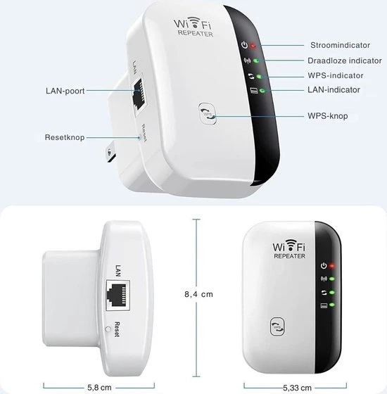 With this Wi-Fi booster you can easily extend the range of your current Wi-Fi network. This device works as a Range Extender and ensures that you have a strong and stable signal everywhere in the house, even in the corners that previously had poor reception. Ideal for larger homes or offices where the Wi-Fi signal does not reach all rooms.