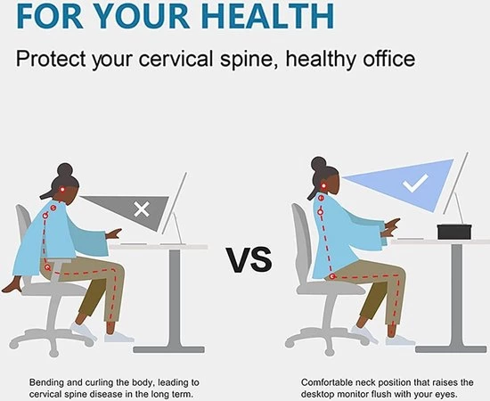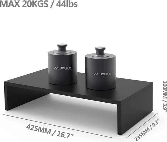 Advantages:This monitor stand riser is made of high-quality MDF and is scratch-resistant. With a maximum capacity of 15 kg, it's suitable for most monitors and laptops. The ergonomic design, at 100 mm high, ensures a comfortable viewing position and helps prevent physical strain.